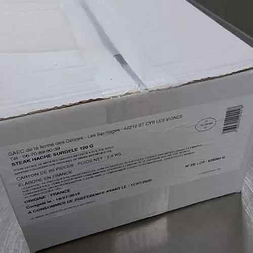 Steaks Hachés Surgelés de 120g en carton de 3.36 kg (soit 28 steaks).